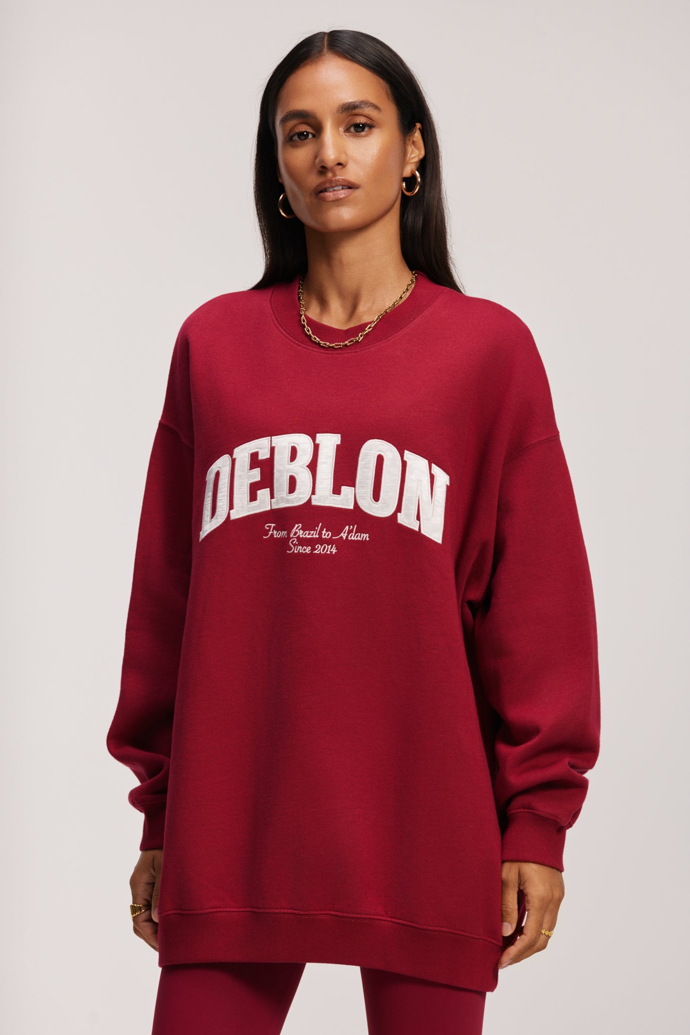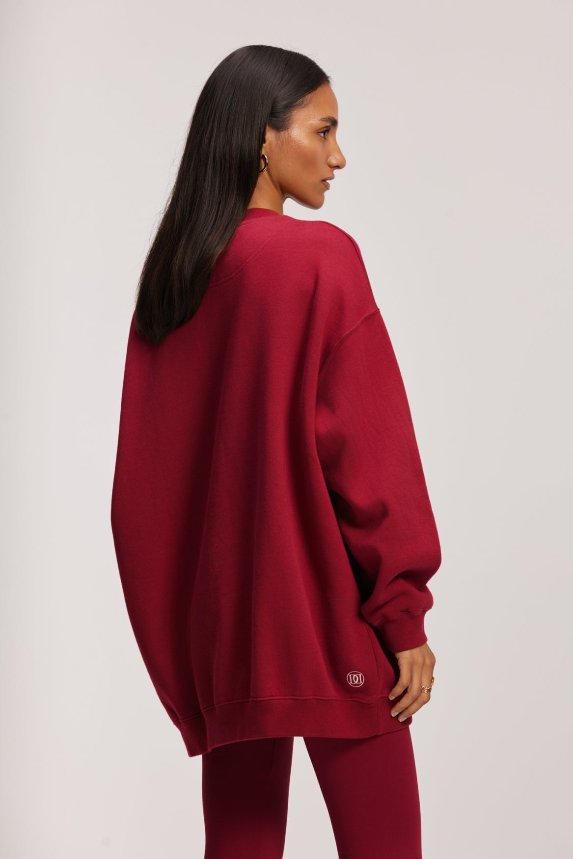 Hitting generously below the hip, our Crimson Red Phoebe Sweater is the ideal sidekick for slim-fit leggings. The soft-touch fleeceback jersey in 100% cotton is all-season proof. Popped over a sleek sports top, transforming workout looks to fashion looks is a no-brainer.