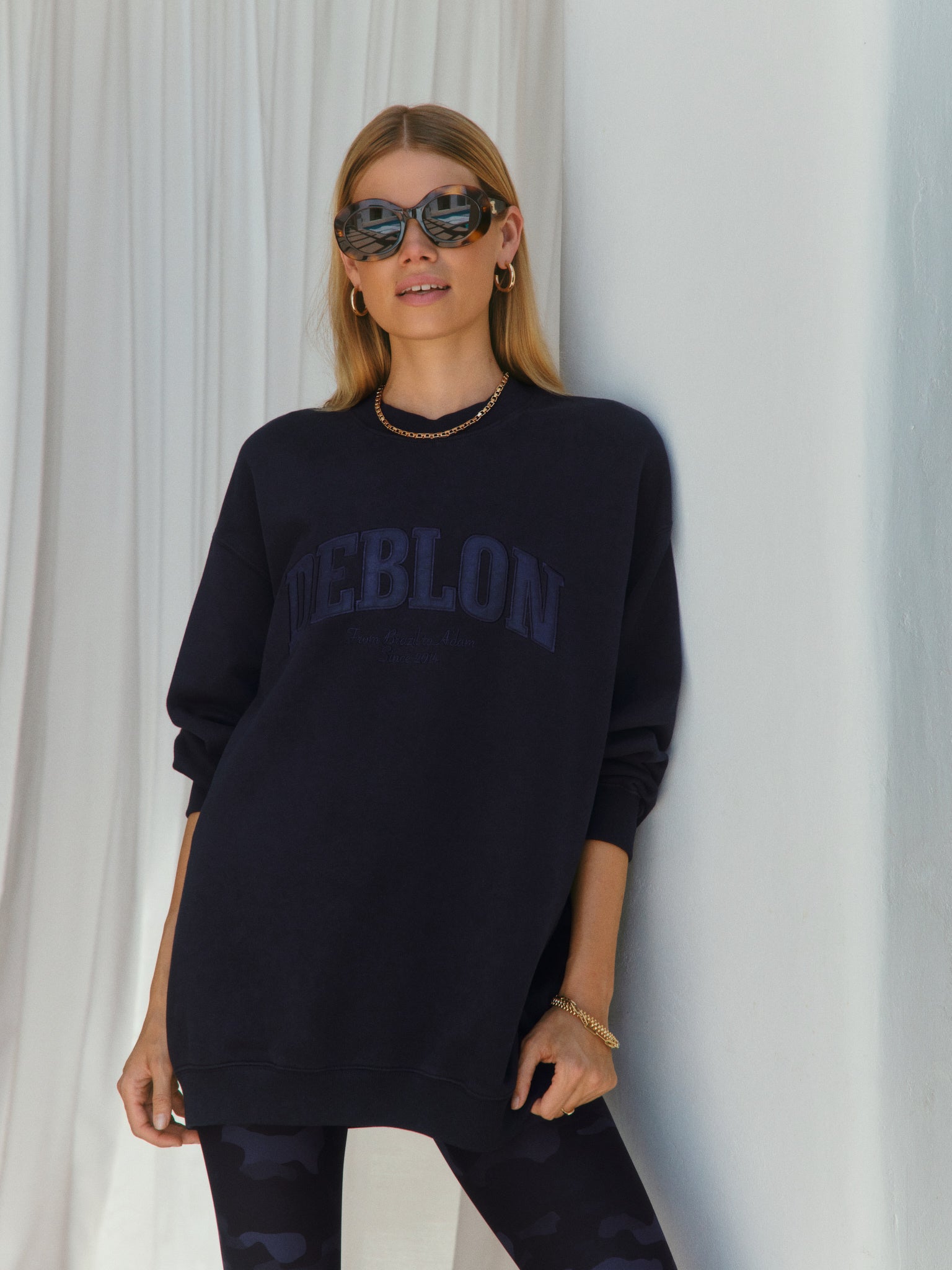 Hitting generously below the hip, our Navy Phoebe Sweater is the ideal sidekick for slim-fit leggings. The soft-touch fleeceback jersey in 100% cotton is all-season proof. Popped over a sleek sports top, transforming workout looks to fashion looks is a no-brainer.