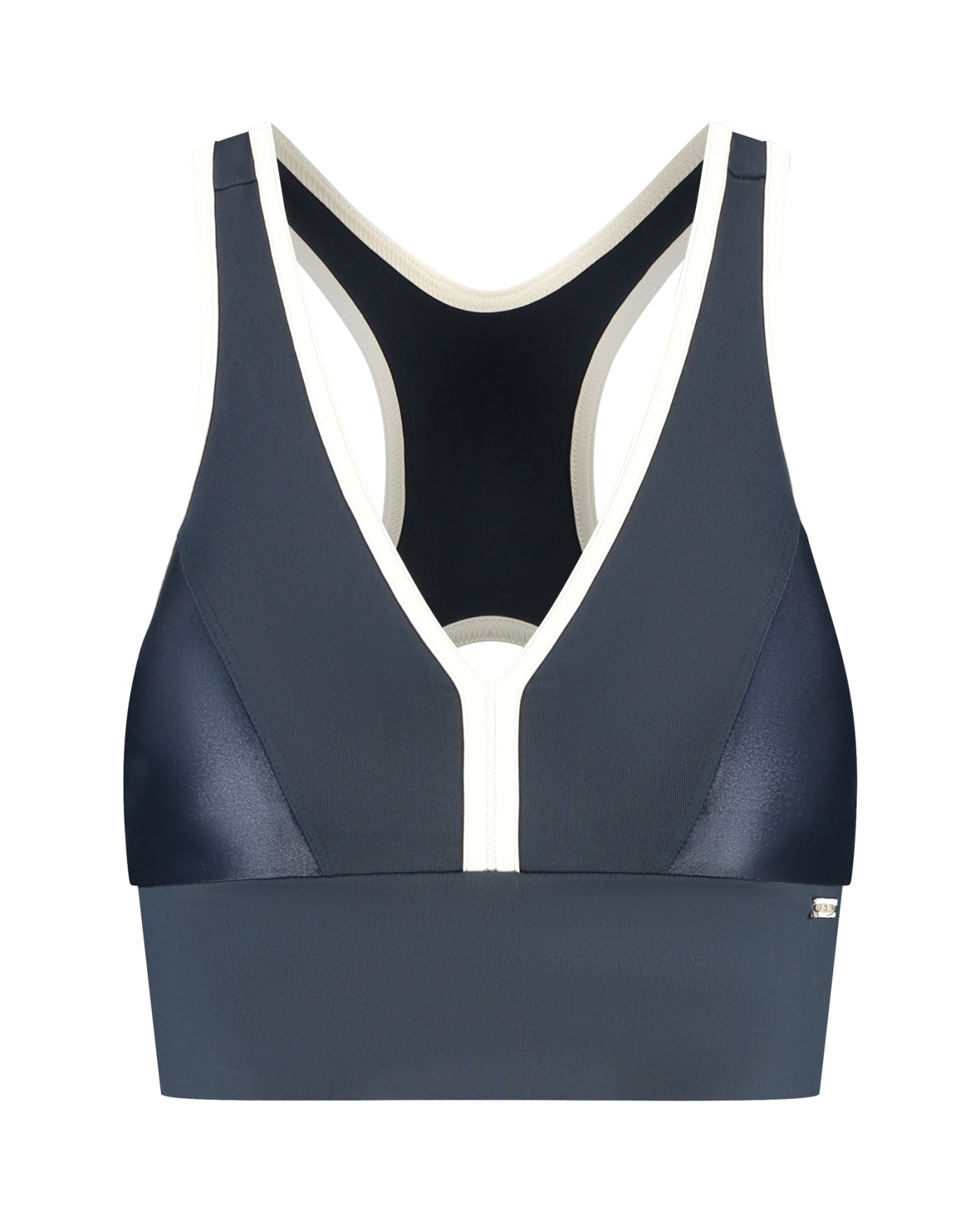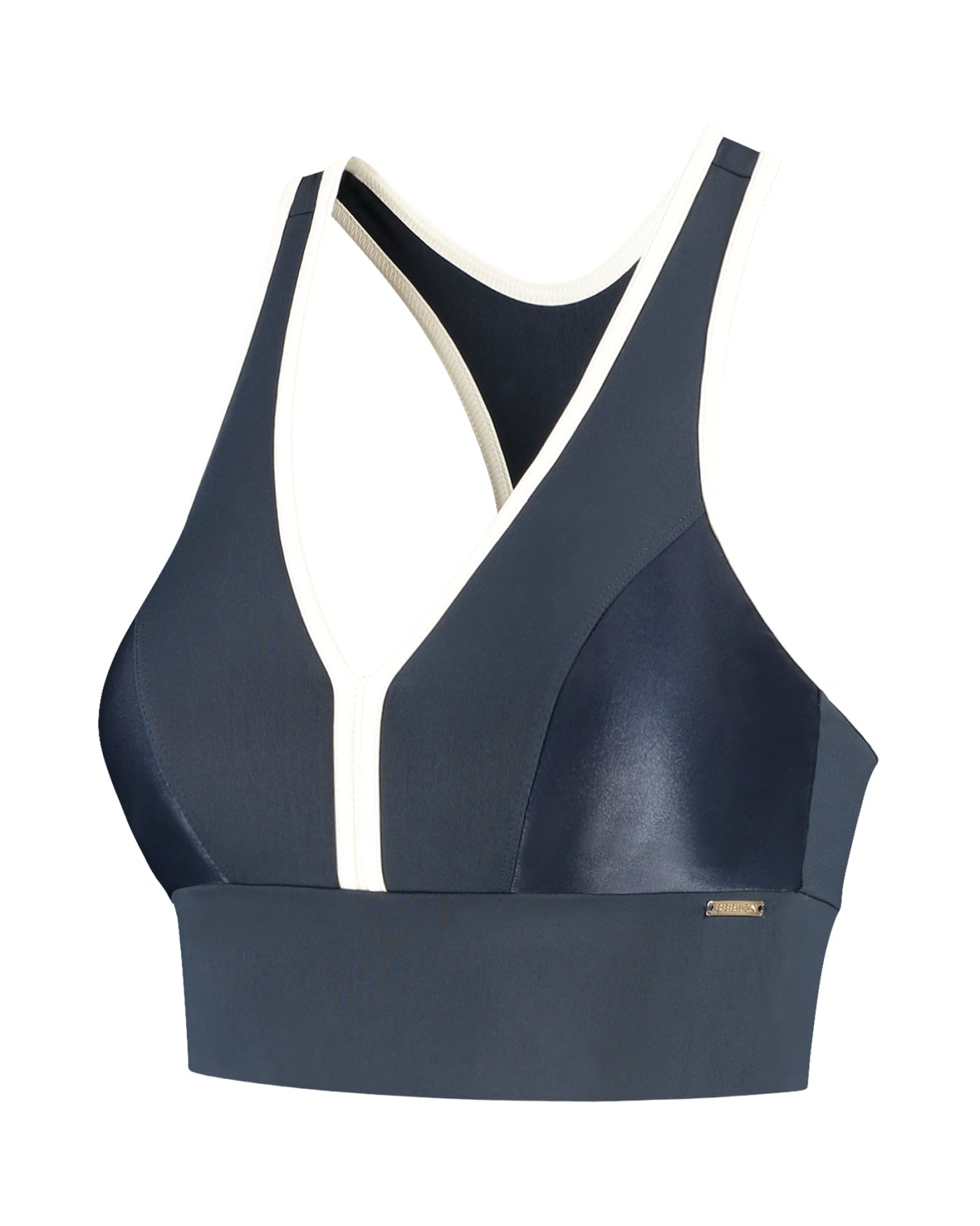 Timeless, stylish & packed with premium functionality. In classy Navy, featuring Shine fabric panels and Pearl edge trims, our Charlie Bra Top brings timeless class to your athleisure wear wardrobe. Medium support, removable padded cups and a 3-step adjustable back fastening provide for maximum flexibility – the shapely neck line and sporty racerback design keep your gym look elegant.