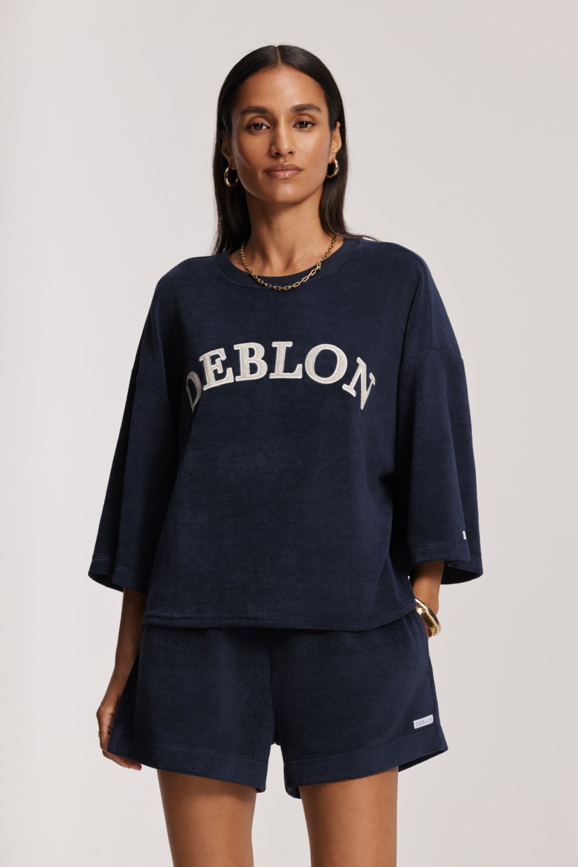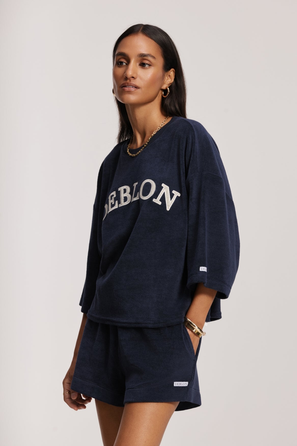 • Woven Deblon label above the hem
