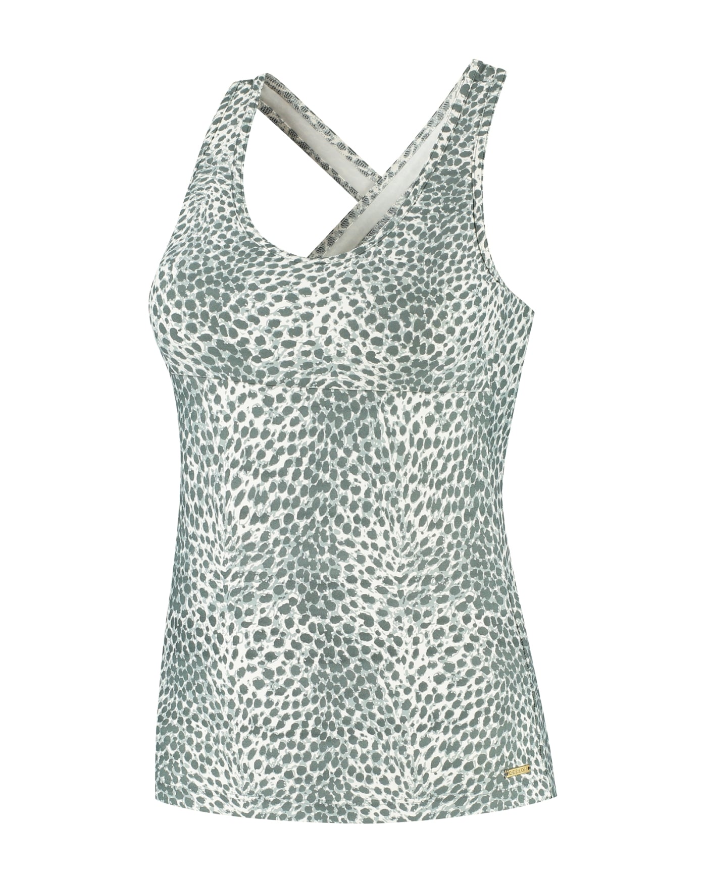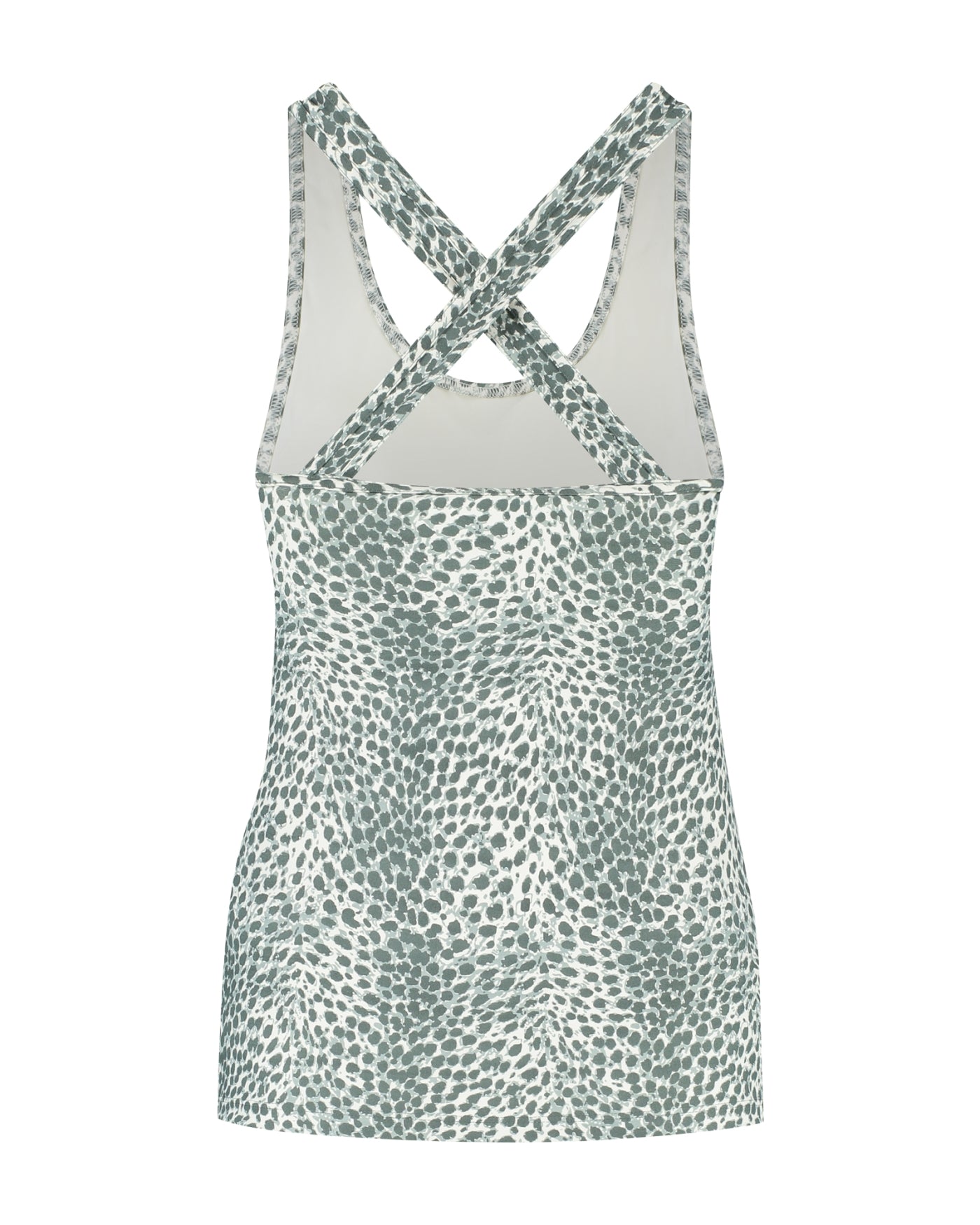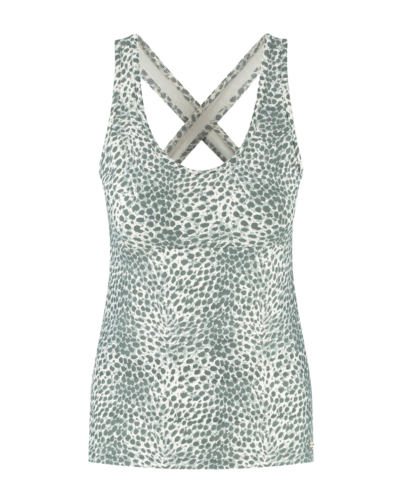 A bestseller with bravado. The ongoing success of our Zoe Top is rooted in the perfect balance between fashion and functionality. Shaping streth jersey, breathable comfort, a streamlined fit with crossing back straps, an iconic Cheetah print in on-trend Sage green. Need we say more?