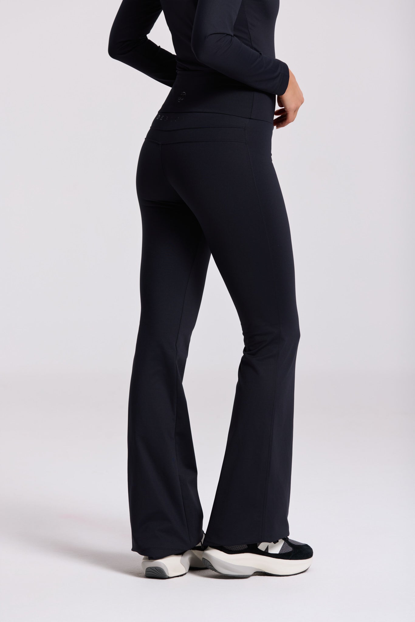 ThermaLuxe winter jersey, brushed inside, tonal logo print at side seams and rear waistband. Isa X-Flared sits smooth at the hip and thigh. From the knee down, the legs flare wider towards the hem – in total approximately 6 cm wider than our regular Celine Flared Leggings
