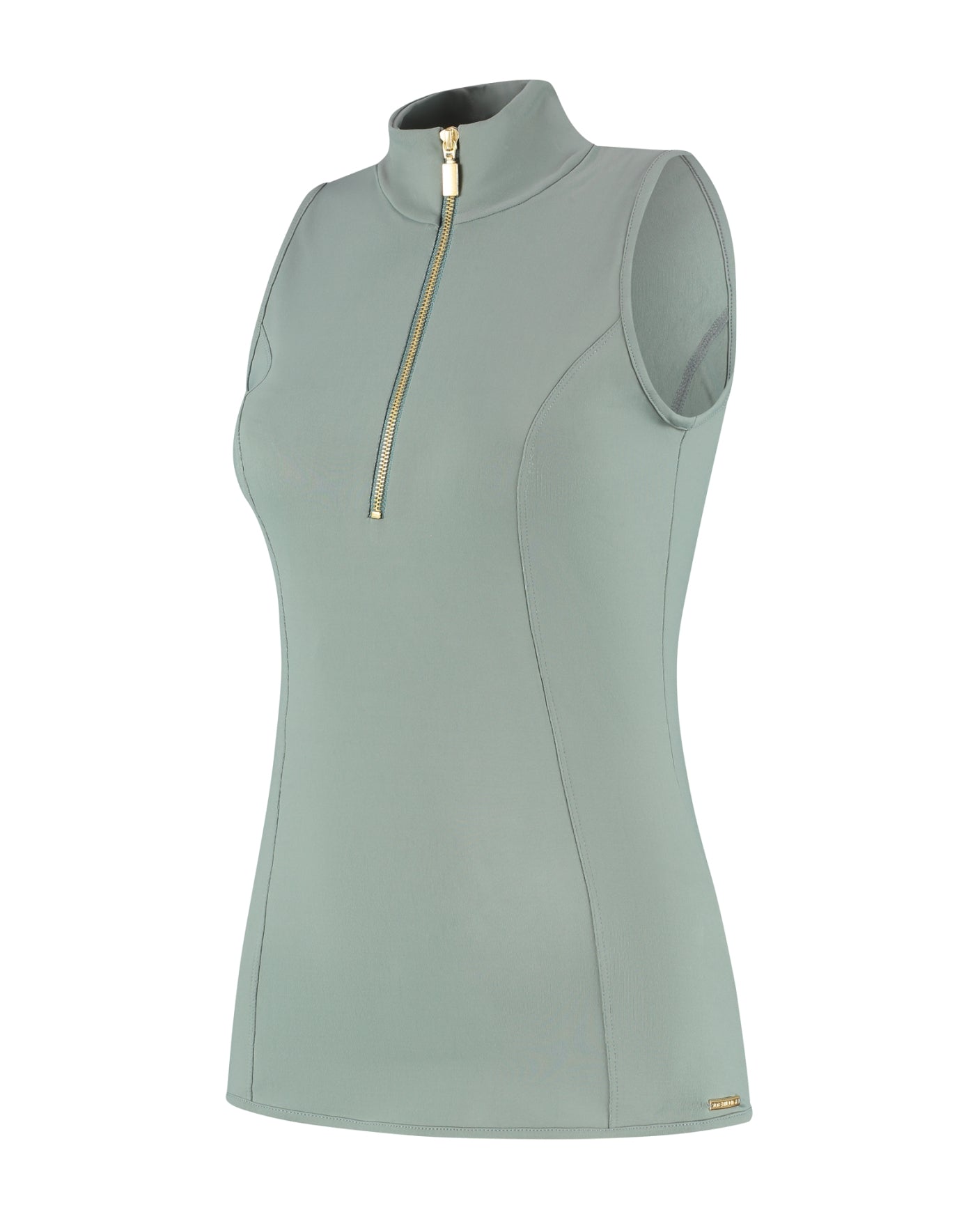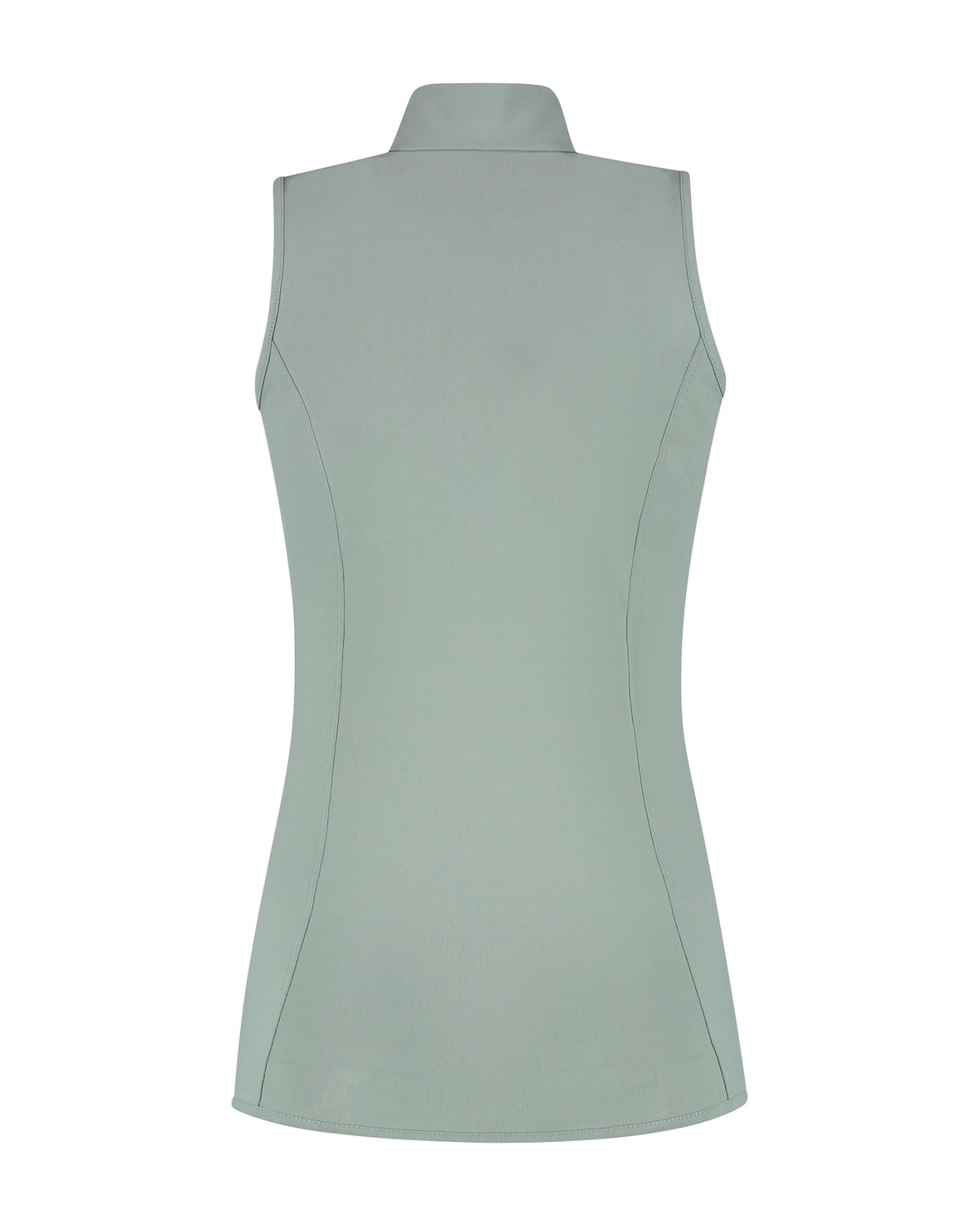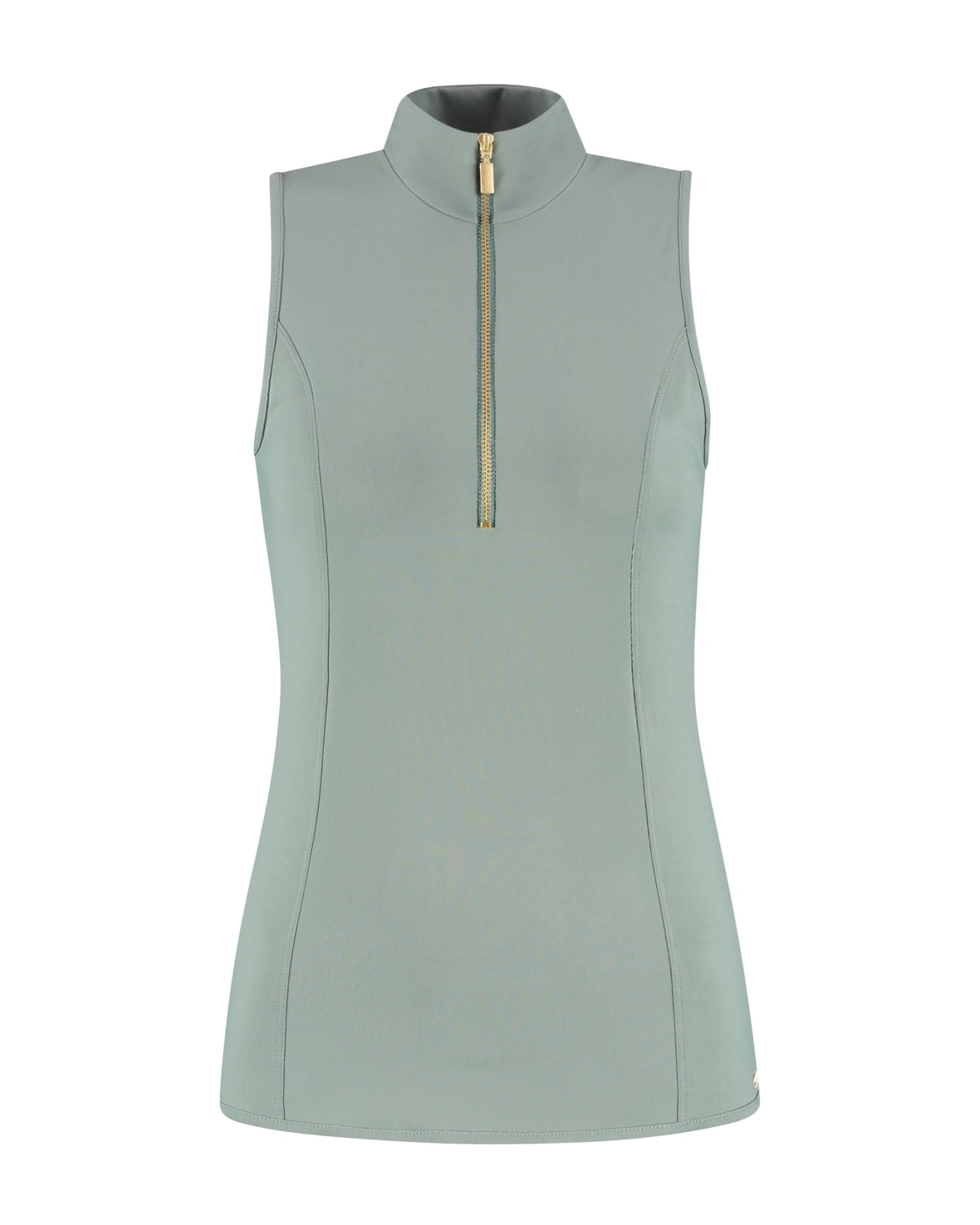 Chic & shapely. Rosy Sleeveless in on-trend Sage Green: a hard-to-resist performance piece, made for dynamic athleisure wear looks. Adding understated chicness, the turtleneck collar features a refined gold-tone zipper - ready to be styled zipped up or down, depending on the intensity of your workout.